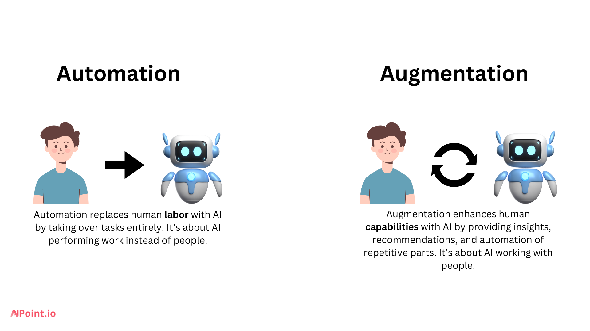 Augmentation, on the other hand, is when AI works alongside humans to help them be more effective. AI doesn’t replace the decision-making process, it enhances it by providing insights, recommendations, and automation of repetitive parts of a task.